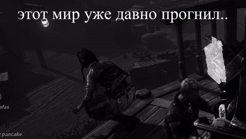 Meg Thomas in Dead by Daylight gameplay, reflecting on a world that has long since rotted, amidst rain.