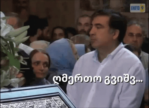 Mikheil Saakashvili speaks passionately, with the Georgian caption 'God help us' displayed on screen.