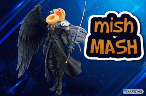 A unique mishmash featuring a Sephiroth-like character with peaches on his head and the 'mish MASH' logo.