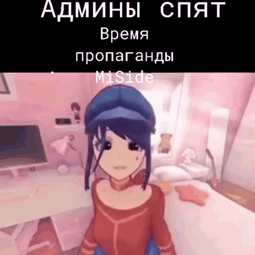 Animated girl Miside Mita in a pink room, wearing a red shirt and blue cap, with Russian text overlay.