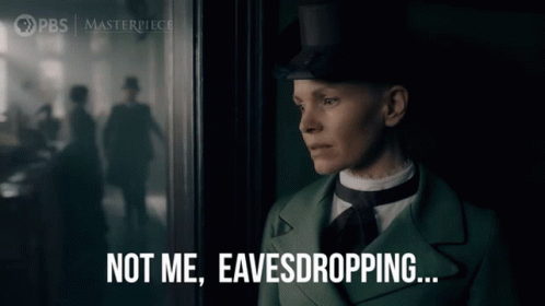 Miss Scarlet from 'Miss Scarlet And The Duke' intently eavesdropping, wearing a top hat and green coat.
