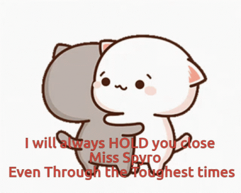 Two cute cartoon cats hugging with a heartfelt message: 'I will always HOLD you close Miss Spyro Even Through the Toughest times.'