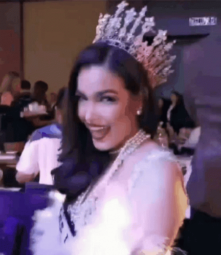 Paweensuda Drouin, also known as Fahsai, smiles wearing her Miss Universe crown and pearls at an event.
