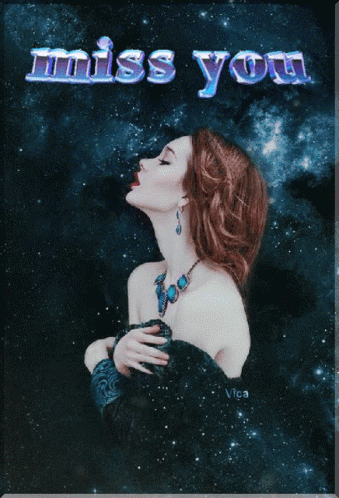 A beautiful lady in a starry background with animated 'miss you' text, conveying a feeling of longing.