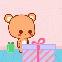 Missubear opens a gift, only to be surprised by a kiss from another bear, leading to a blush.