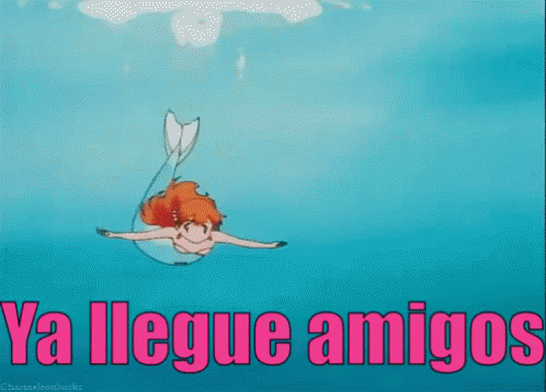 Misty from Pokémon, as a mermaid, joyfully swims underwater with Horsea, exclaiming 'I've arrived friends!'