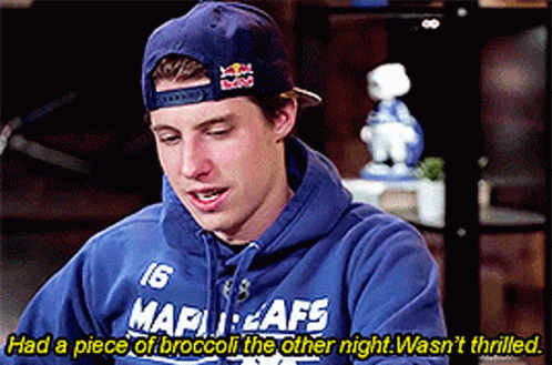 Mitch Marner, wearing a Maple Leafs hoodie, shares his less-than-thrilled experience with eating broccoli.