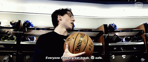 Mitch Marner delivers a message to his team in the locker room, holding a basketball.