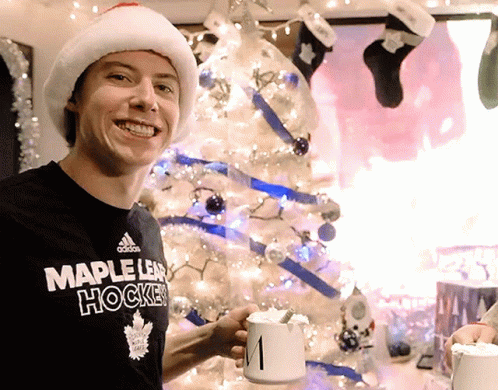 Mitch Marner celebrates the holidays, smiling in a Santa hat and Maple Leafs shirt with hot chocolate.