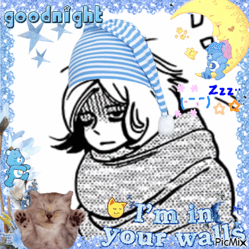 Mithrun from Dungeon Meshi wearing a sleep cap, surrounded by 'goodnight' and 'I'm in your walls' text.