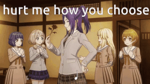 Kaoru Seta and other anime girls in school uniforms with the text 'hurt me how you choose' overlaid.