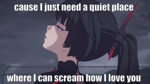Raiden Mei from Honkai Impact with a Mitski lyric: 'Cause I just need a quiet place where I can scream how I love you.'