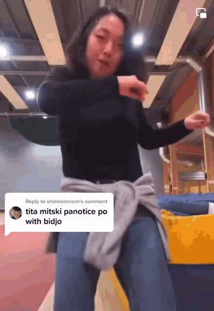 Tita Mitski performs a lively TikTok dance in a gym, responding to a fan's request for a video.