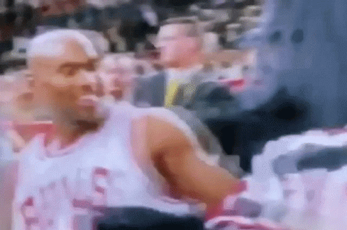 Michael Jordan gives a memorable look while sitting courtside with another player during a basketball game.