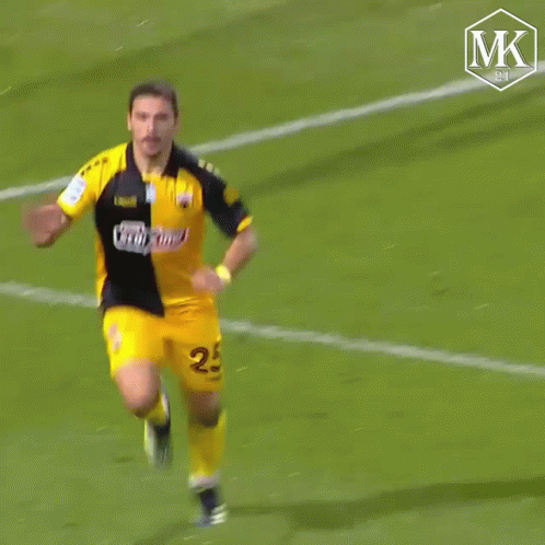 Galanopoulos of AEK FC passionately celebrates a goal on the soccer field, wearing his yellow and black uniform.