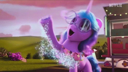 Izzy Moonbow from My Little Pony: Make Your Mark dancing with sparkling glitter effects in front of a Netflix sign.