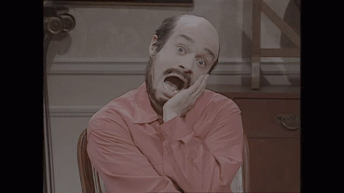 A bald man with a mustache, wearing a pink shirt, makes a surprised and funny face.