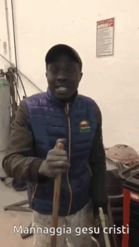 A man in a blue vest and cap holds a stick, smiling and speaking, with the Italian phrase 'Mannaggia gesu cristì' displayed.