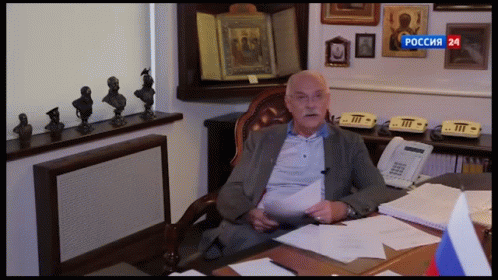 A man with a mustache and glasses sits at a desk in an office, with the Russia 24 channel logo visible.