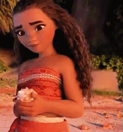 Disney's Moana stands on a sandy beach, holding a delicate seashell, with ocean waves in the background.