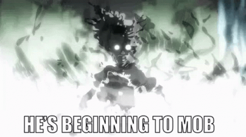Shigeo 'Mob' Kageyama from Mob Psycho 100 in a powerful state with the meme 'He's Beginning to Mob'.