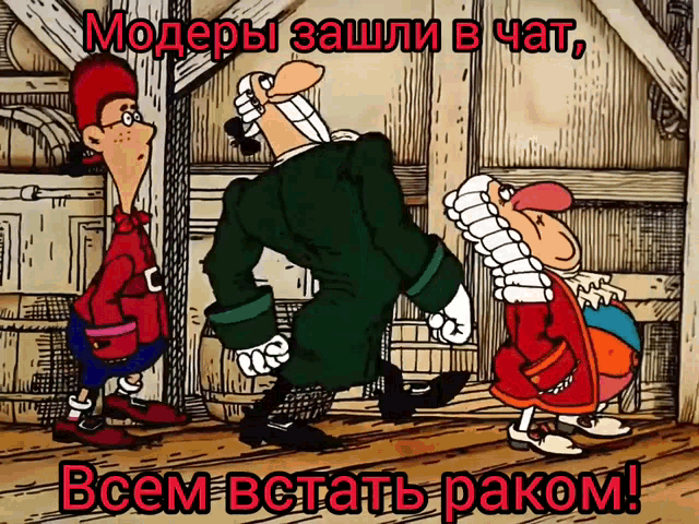 Three cartoon characters, including Admin and Livesey, react to the arrival of moderators in a chat, with a humorous Russian caption.
