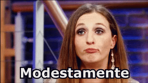 A woman makes a modest expression with the word 'Modestamente' displayed, conveying humility and a subtle reaction.