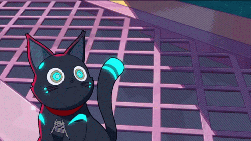 a black cat with glowing eyes and a red collar is standing on a grid floor