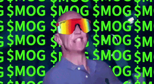 Man in Pit Viper sunglasses with hands raised, surrounded by '$MOG' text, embodying the crypto meme.