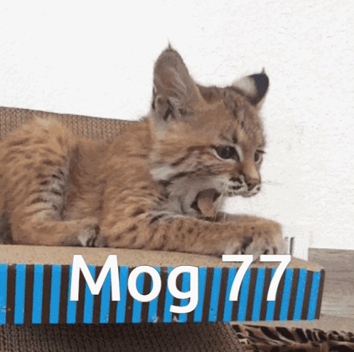 An adorable kitten, Mog Mog 77, yawns widely while resting on a cardboard box labeled 'Mog77'.