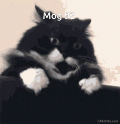 A fluffy black and white cat with "Mog 92" text, referencing the iconic "Mogambo Khush Hua" phrase.