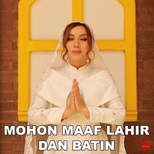 Balena in a white dress and veil, making a gesture of apology with the text 'Mohon Maaf Lahir Dan Batin'.