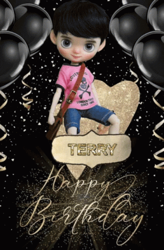 A birthday card featuring a doll and the name Terry prominently displayed.