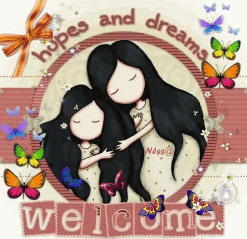 Two cartoon girls with long black hair hug, surrounded by butterflies, with 'hopes and dreams welcome' text.