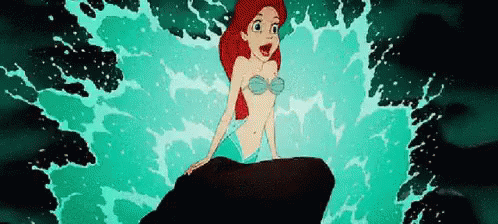 Ariel the Little Mermaid sits on a rock in the ocean and gets her hair wet as a wave splashes over her.