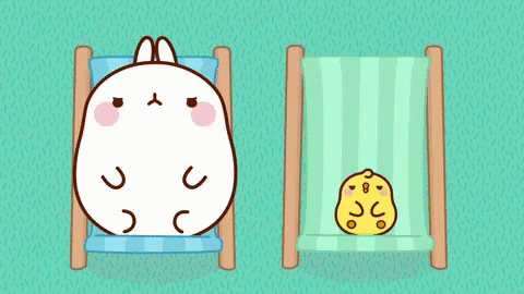 Molang the rabbit and Piu Piu the chick looking annoyed while relaxing on striped beach chairs.