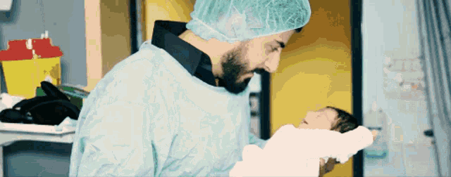 Ismaeil Tamr, wearing a surgical gown, lovingly holds and kisses his newborn baby in a hospital setting.