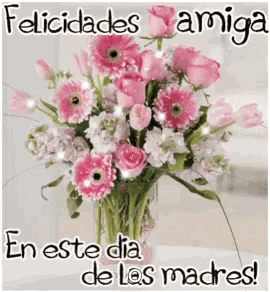 A beautiful bouquet of pink and white flowers with a Spanish greeting for Mother's Day to a friend.