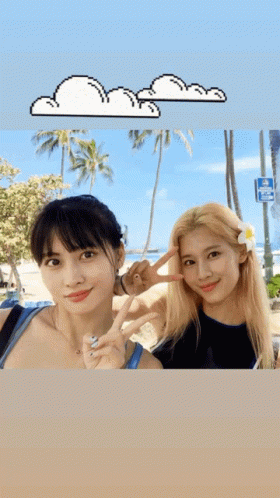 Momo and Sana pose for a photo on a sunny beach, making peace signs with palm trees in the background.