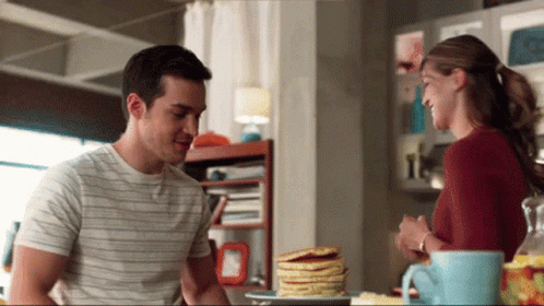 Chris Wood as Mon El enthusiastically devours a towering stack of pancakes in a kitchen setting.