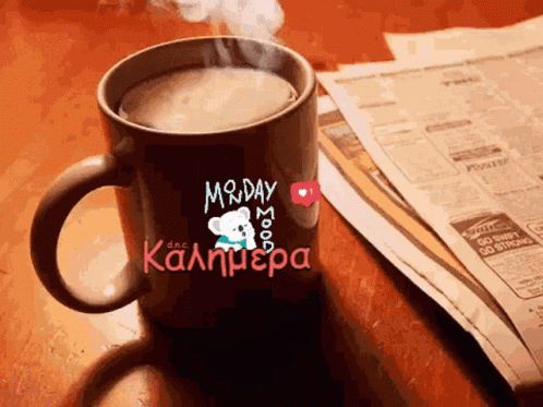 A steaming mug with "Monday Mood" and "Καλημερα" next to newspapers, perfect for a good morning.