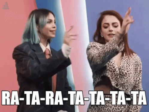Annalisa and Rose Villain dance energetically to 'Mondo Dominazione Eva' with the iconic 'Ra Ta Ta Ta Ta' sound.