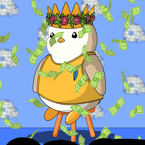 A crowned Pudgy Penguin sits on a stool as dollar bills rain down, symbolizing crypto wealth and abundance.