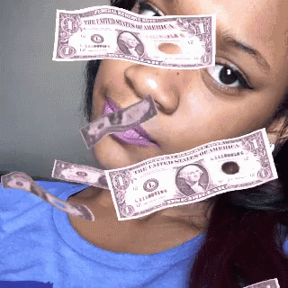 A young woman with purple lipstick has digital dollar bills floating around her face in a fun visual effect.