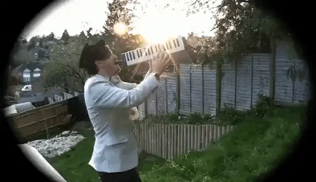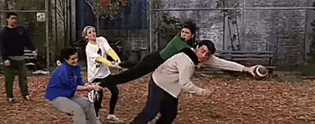 Monica Geller dances in a purple sweater while Chandler Bing watches her from the couch in Friends.