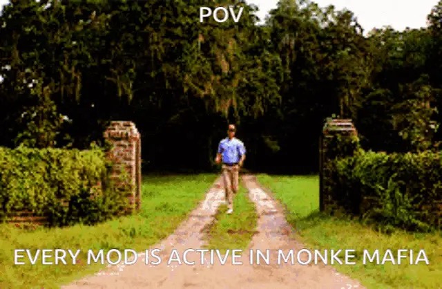 A chimpanzee, referred to as 'monke', walks towards the camera, then its face fills the frame in a close-up.