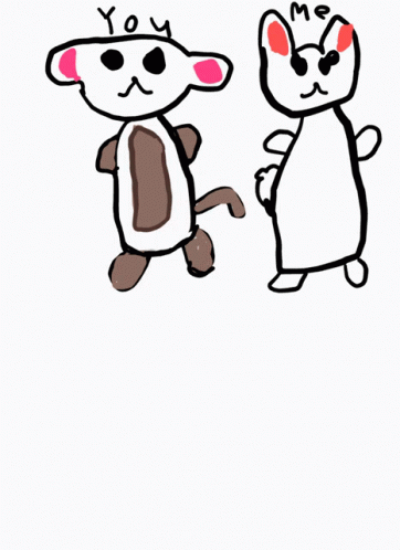 A charming drawing depicting a monkey and a bunny surrounded by hearts, with 'You', 'Me', and 'us!' captions.