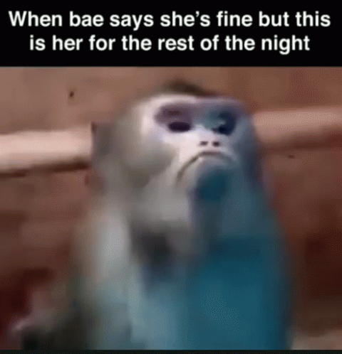 A monkey pouting with a relatable caption about a partner saying they're fine but aren't.