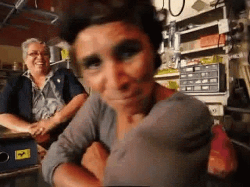 Monse makes a humorous, exaggerated face while looking at the camera in a workshop setting.