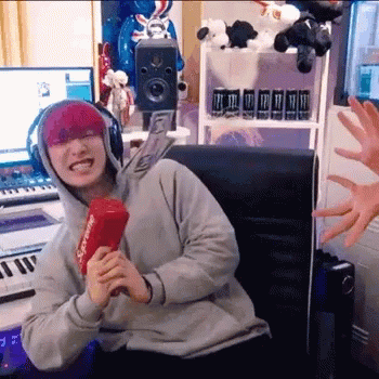 Monsta X's Wonho, with pink hair and headphones, reacts excitedly as money rains down around him.